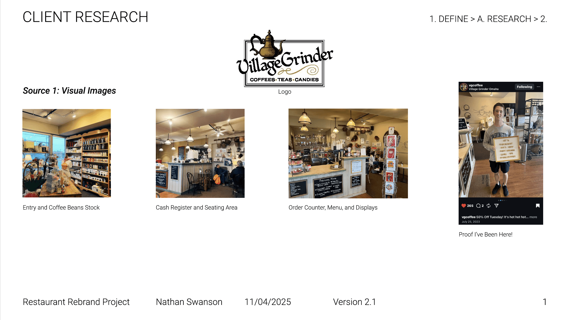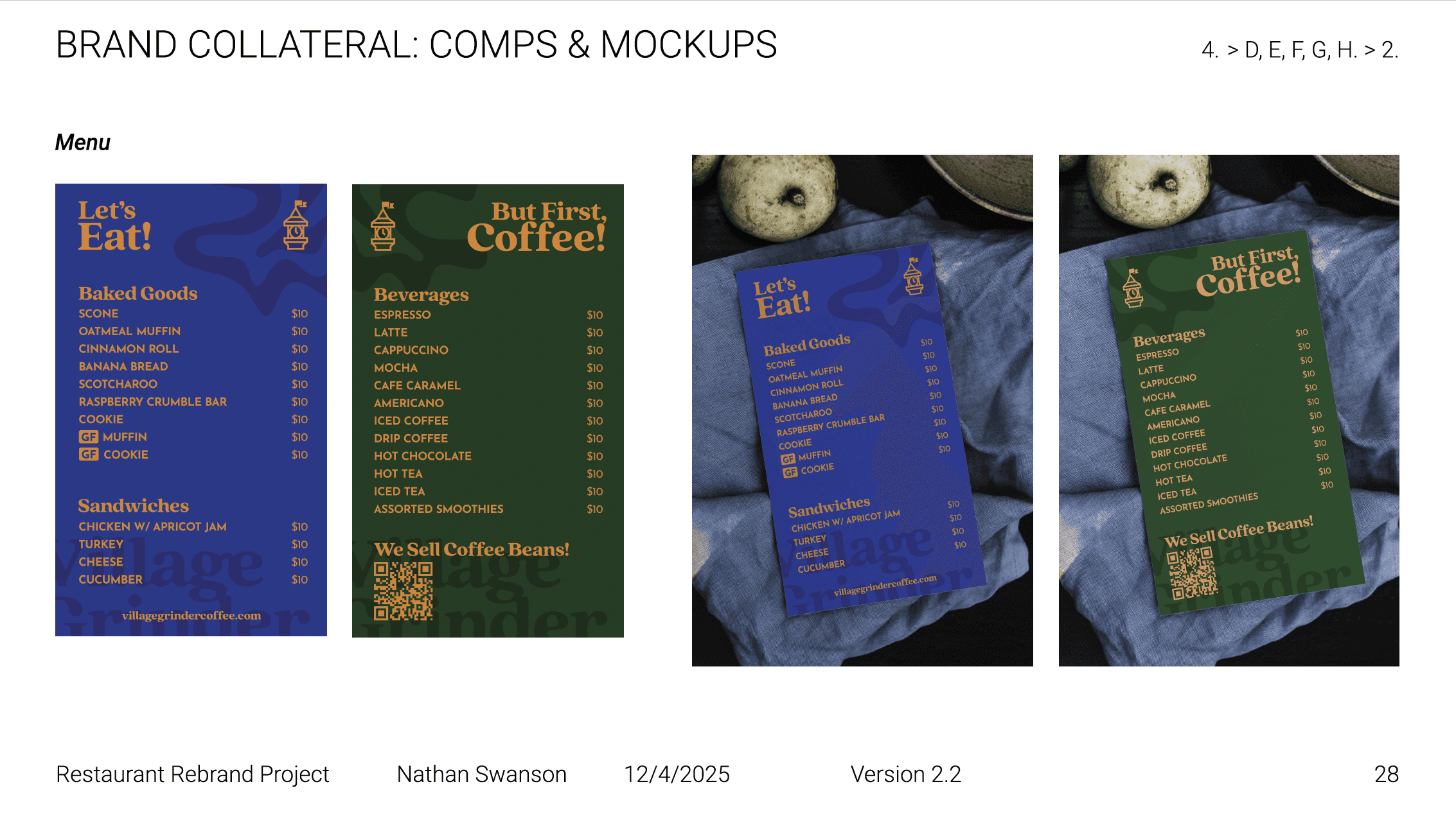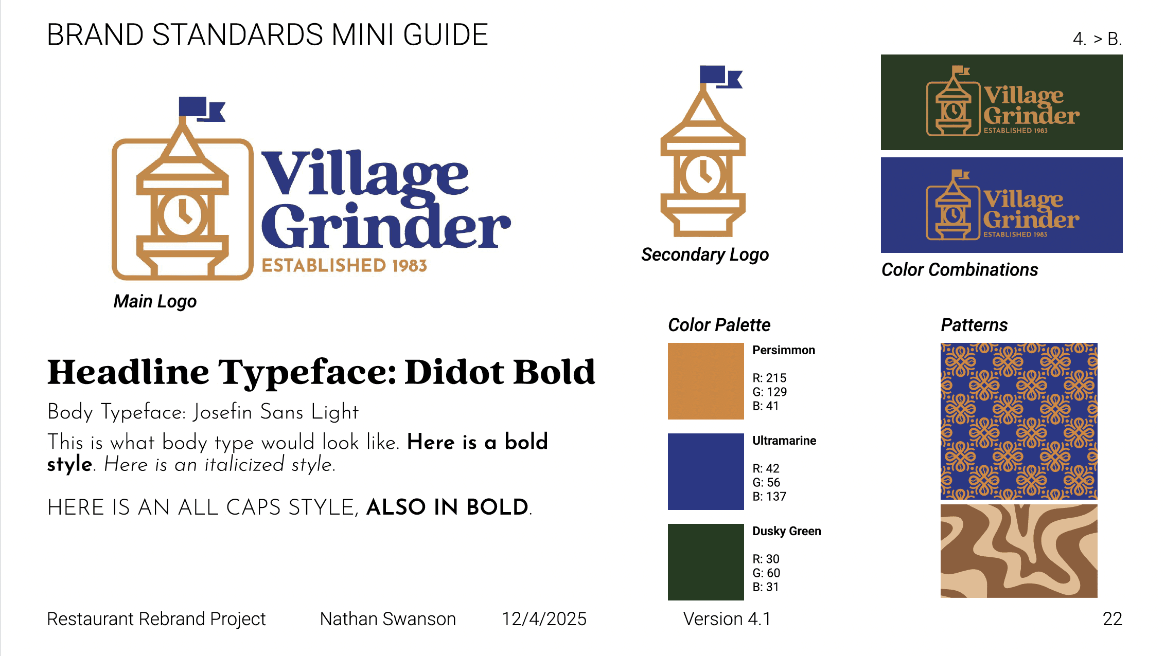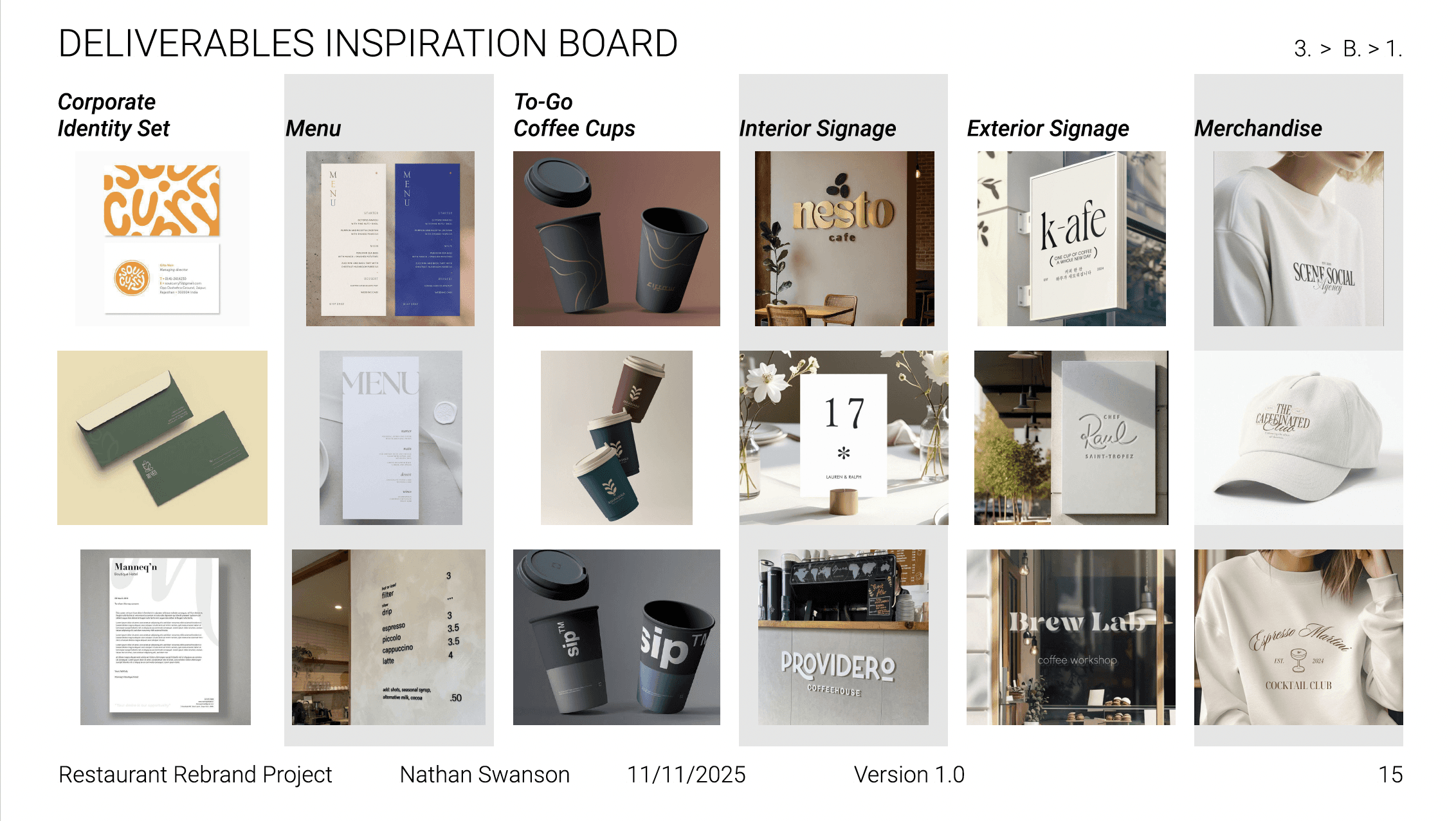 Complete a complete branding redesign for a restaurant, cafe, coffeeshop, etc. Choose an establishment small enough to have a unique story/meaning to a community, but big enough that they would fund a redesign of this caliber. Complete a two-month long process report, starting with gathering information and imagery of your place, and finishing with a complete brand standards guide, 7+ piece deliverables list, and high-quality mockups.