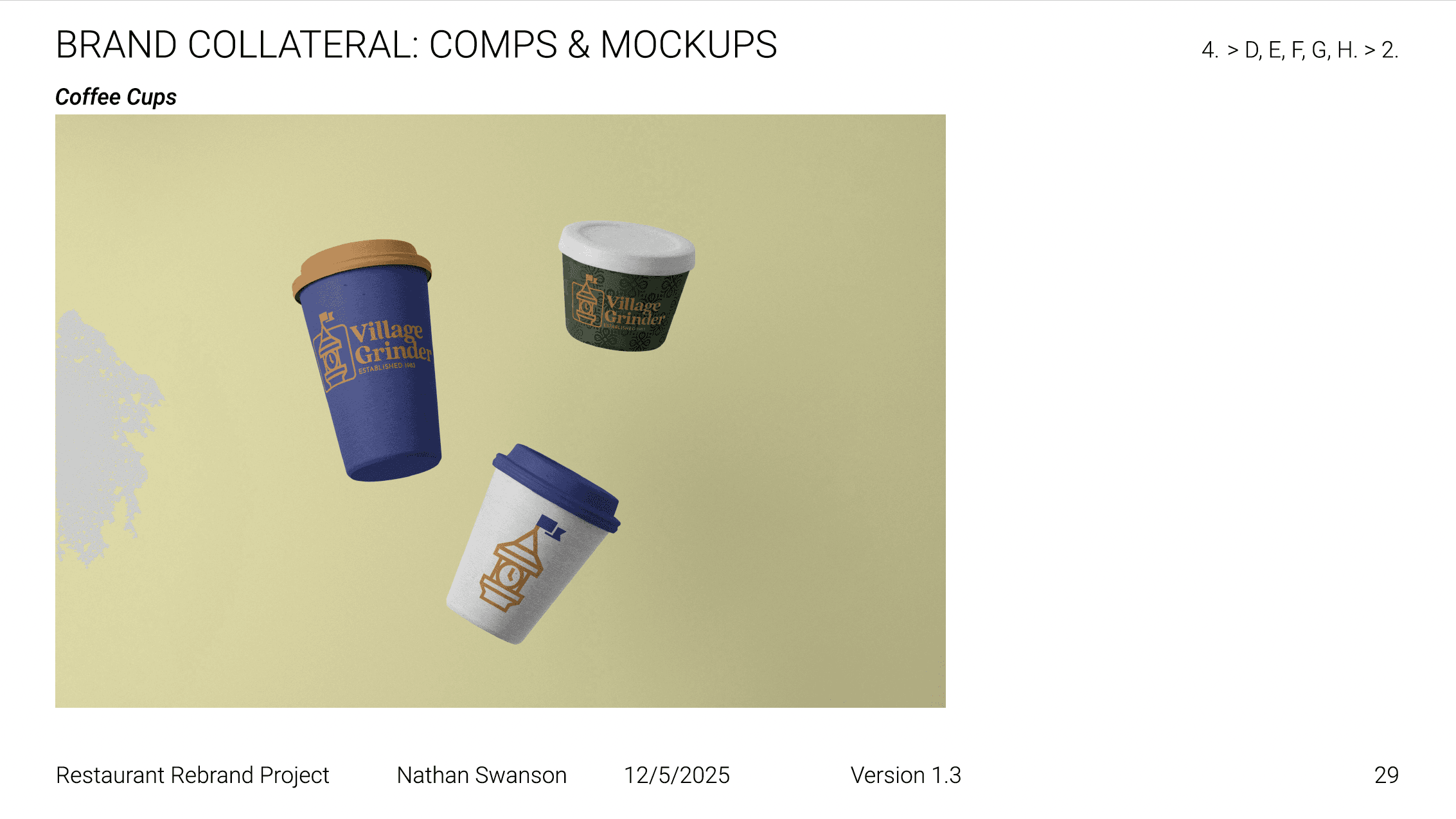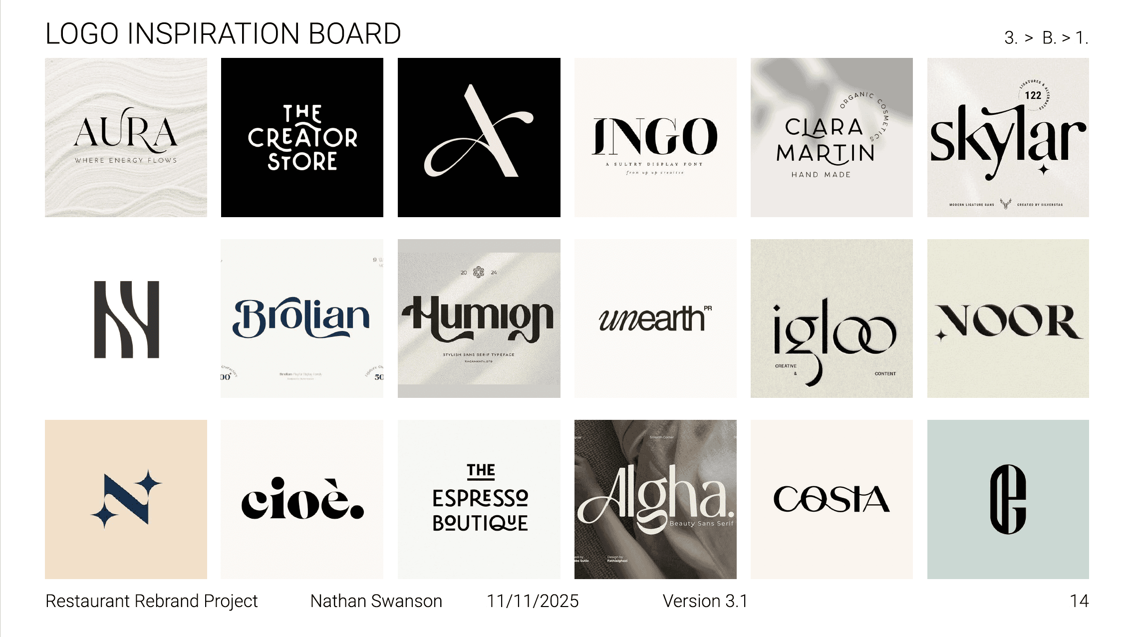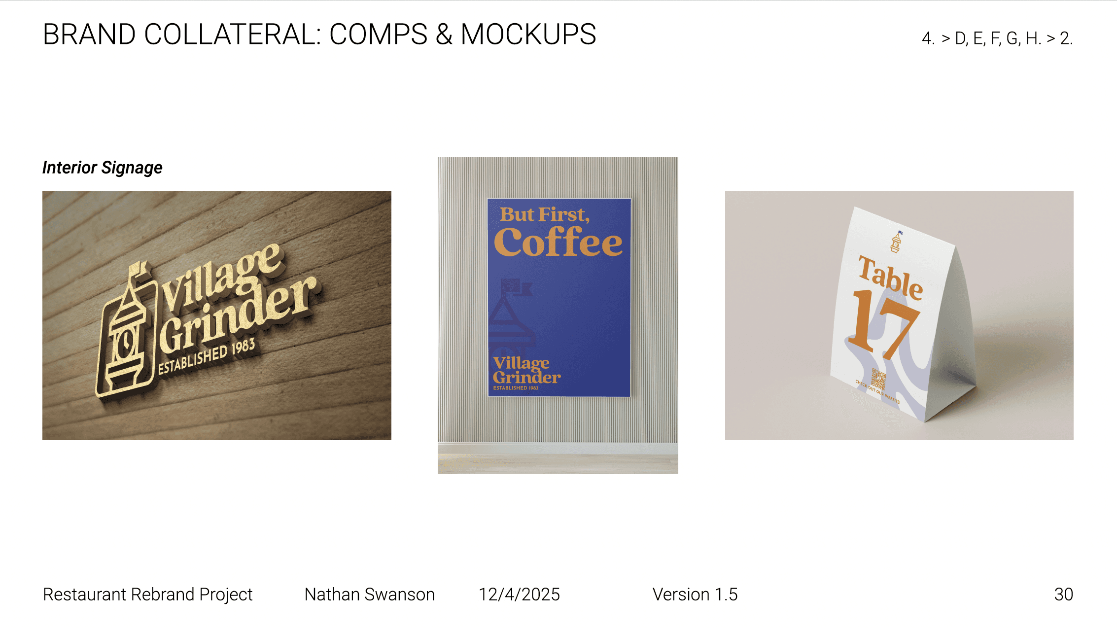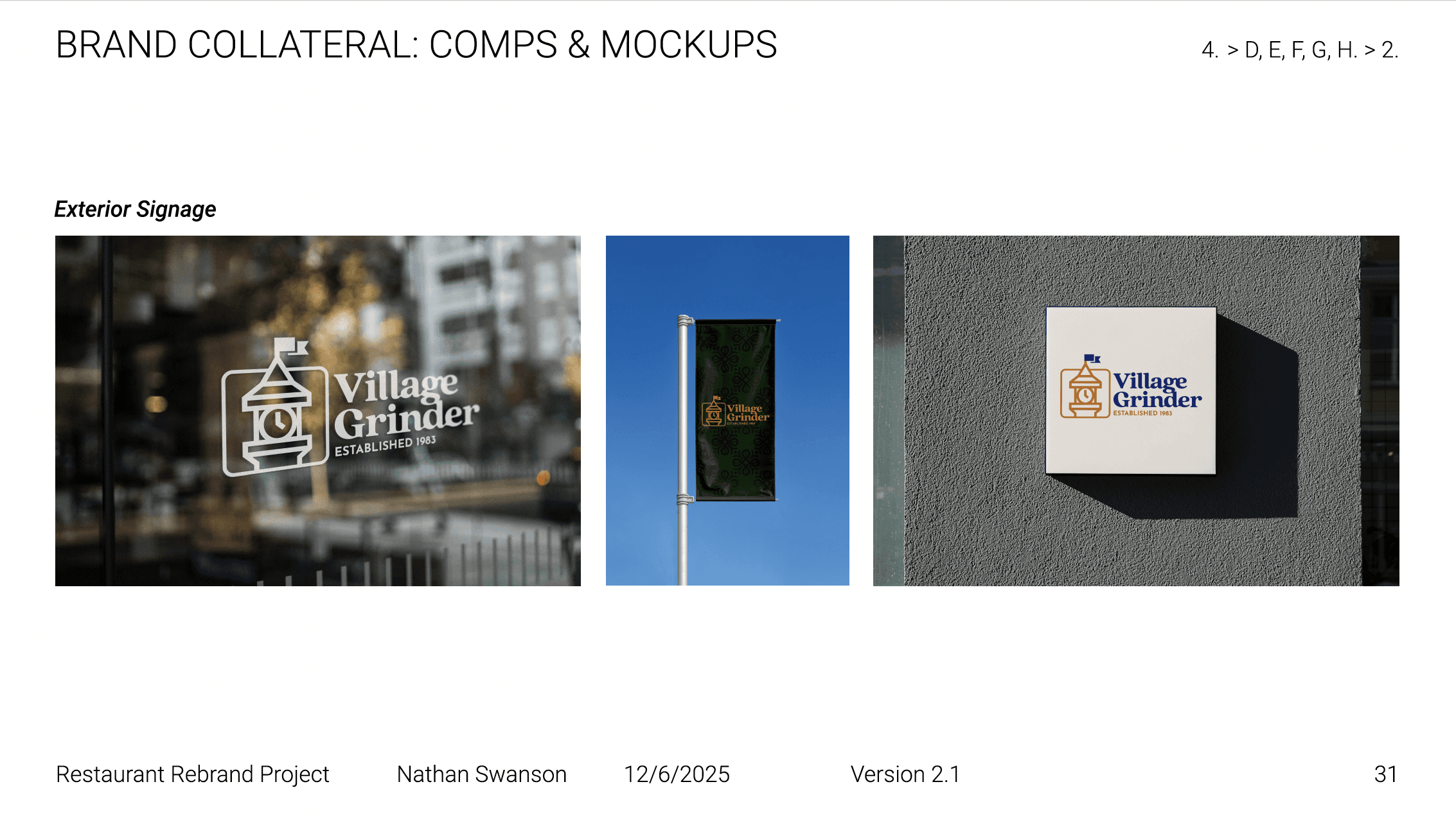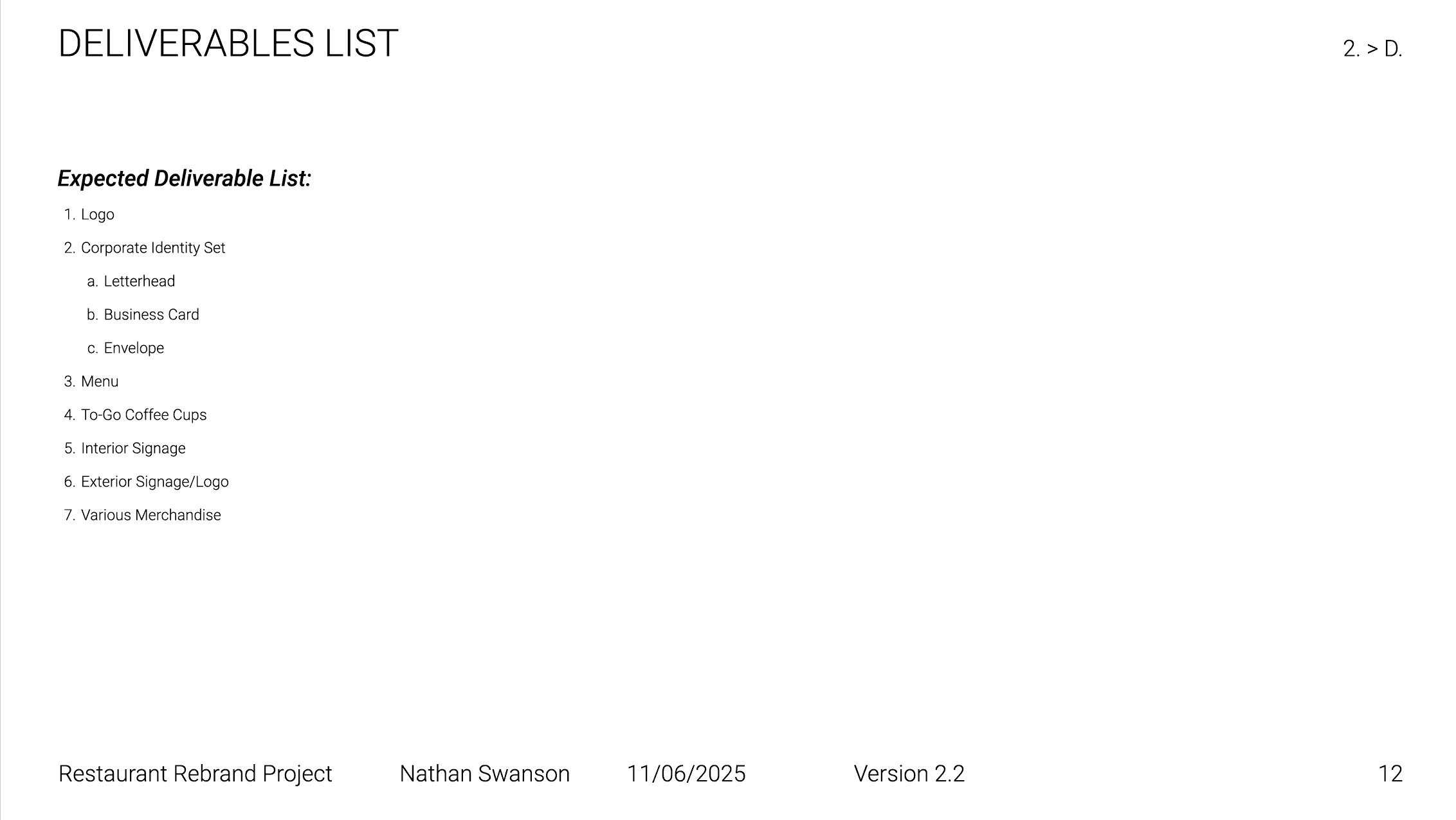 Complete a complete branding redesign for a restaurant, cafe, coffeeshop, etc. Choose an establishment small enough to have a unique story/meaning to a community, but big enough that they would fund a redesign of this caliber. Complete a two-month long process report, starting with gathering information and imagery of your place, and finishing with a complete brand standards guide, 7+ piece deliverables list, and high-quality mockups.